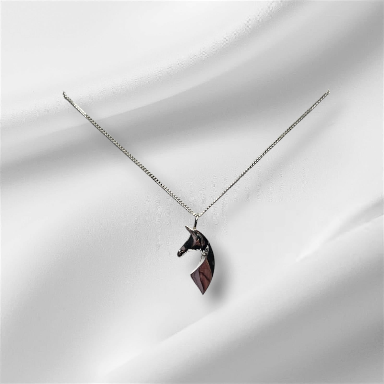 Argentium Silver Cast Ribbon Horse Torso Pendant paired with an Sterling silver chain, renowned for its exceptional shine, tarnish resistance, and hypoallergenic properties. The sleek and durable chain complements the pendant’s flowing design, offering a harmonious blend of style and functionality for any occasion.
