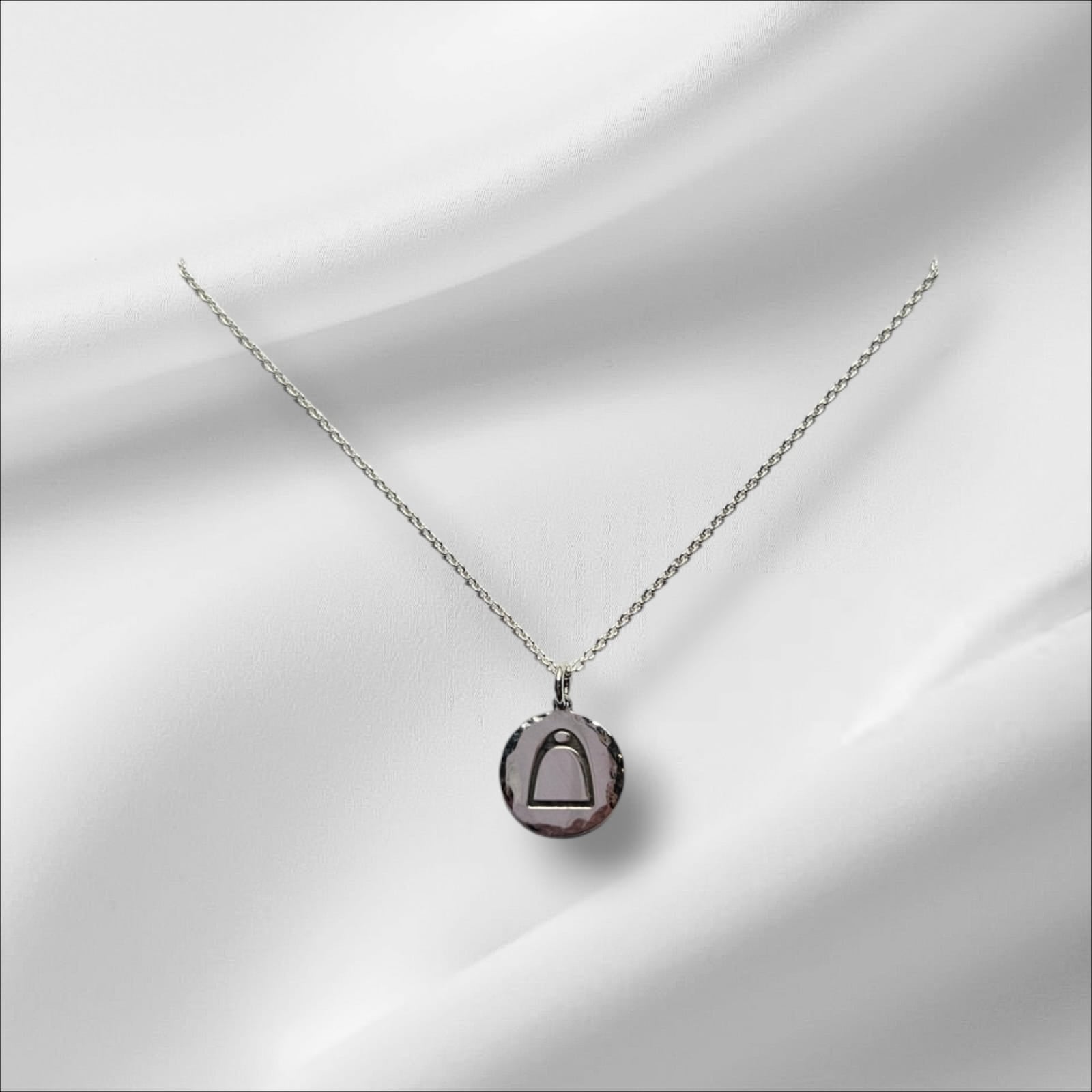 Argentium Silver Hammered Round Pendant with Stirrups Engraved, paired with an Sterling silver chain, known for its exceptional tarnish resistance, brilliant shine, and hypoallergenic properties, this pendant is as durable as it is stylish. The sleek chain complements the hammered pendant, creating a harmonious and sophisticated look that is perfect for both everyday wear and special occasions.