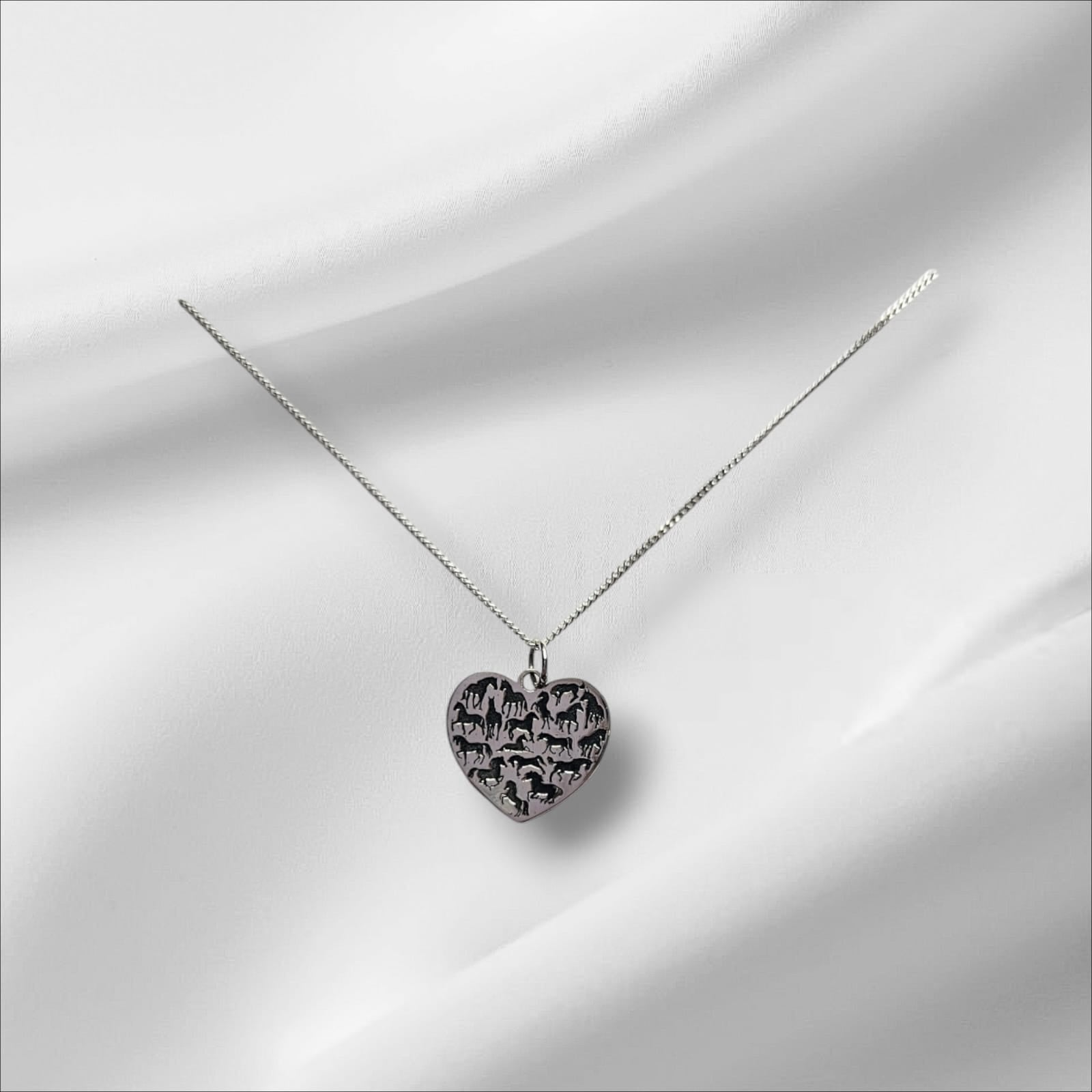 Argentium Silver Heart pendant with Multiple Horses engraved, paired with an Argentium silver chain, known for its exceptional brilliance, tarnish resistance, and hypoallergenic properties. The chain's sleek design complements the pendant, ensuring a balanced and sophisticated look that can transition effortlessly from everyday wear to special occasions.