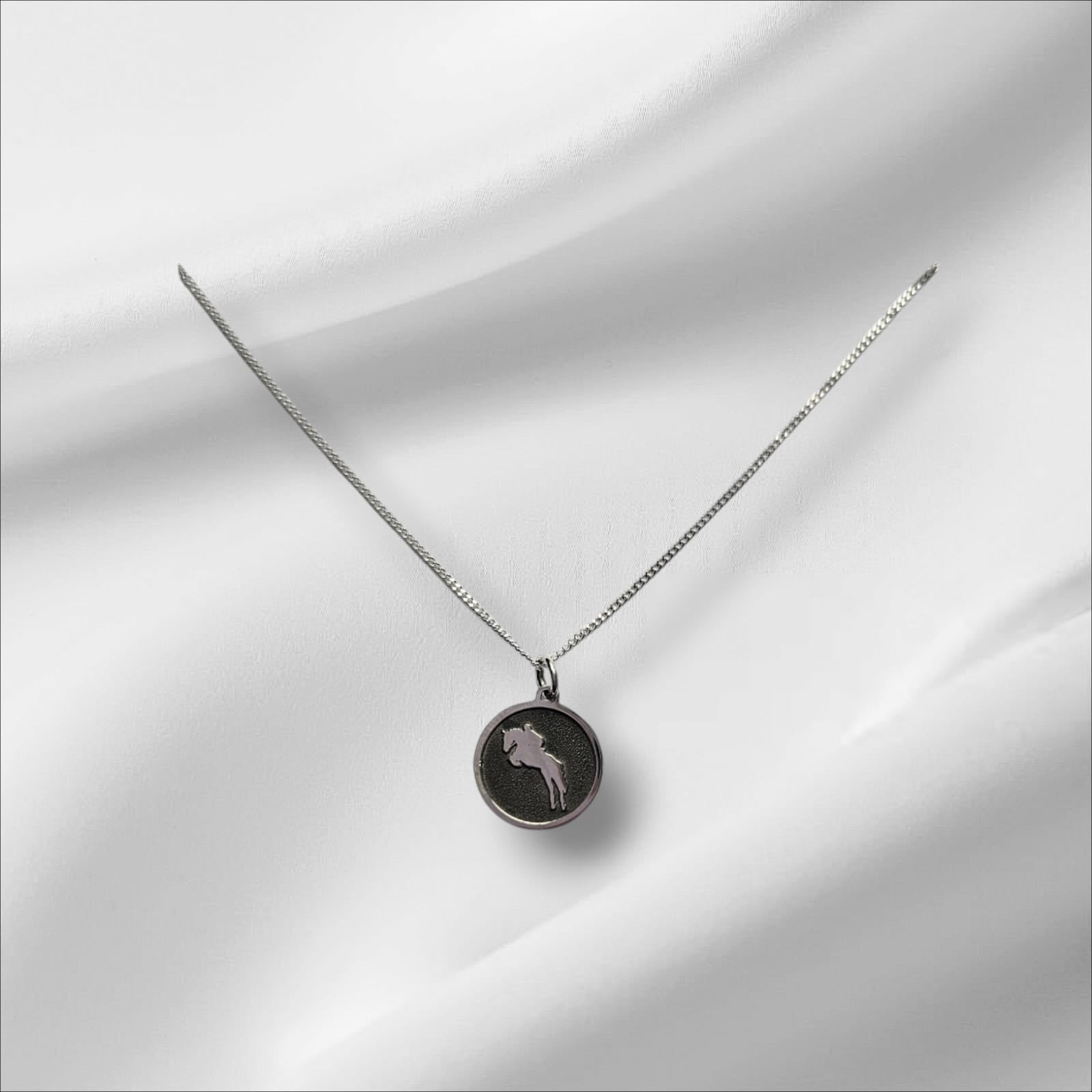 Argentium silver round pendant with Jumping horse embossed is paired with a Sterling silver chain, prized for its superior shine, tarnish resistance, and hypoallergenic properties. The sleek and durable chain perfectly complements the pendant, creating a timeless and elegant look suitable for any occasion.